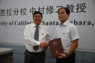 西电副校长杨银堂为中村修二教授颁发聘书 西安交大校党委书记张迈曾向中村修二教授颁发聘书